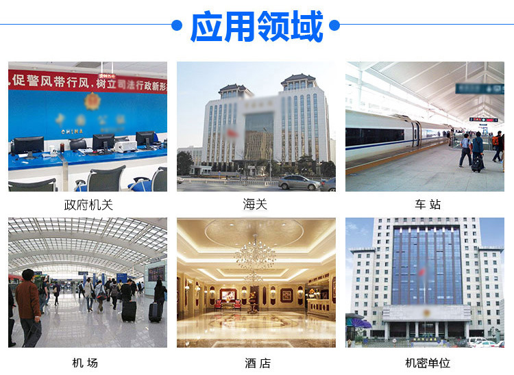 適用于酒店、網(wǎng)吧、賓館、機場、考場入口;公安、邊防、展館、公證處、銀行、證券;監(jiān)獄管理等場所。