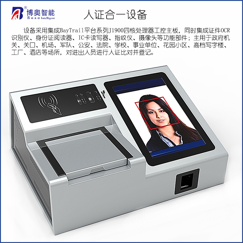 BARZ-HY01(?人證識別系統(tǒng))是博奧智能研發(fā)生產的一款人證比對核驗設備,就是通過識別讀取居民身份證或者其它證件信息,并與現(xiàn)場采集的人臉照片數(shù)據(jù)與讀取的身份證或者其它圖像進行比對,核驗證件與本人是否一致,達到持證人與證件照片相吻合的目的,有效驗證人員身份的真?zhèn)危杉降男畔⒑捅葘Y果可實時上傳至大數(shù)據(jù)采集平臺或推送至現(xiàn)場執(zhí)法客戶端。同時人證核驗一體機也可做為一款小型的訪客登記管理設備;人證核驗一體機具有外觀設計獨特,造型新穎,符合人體工程學,模塊化設計,結構緊湊,便于操作維護,外殼采用優(yōu)質鈑金,表面噴粉高溫烤漆處理,耐磨,防腐蝕;