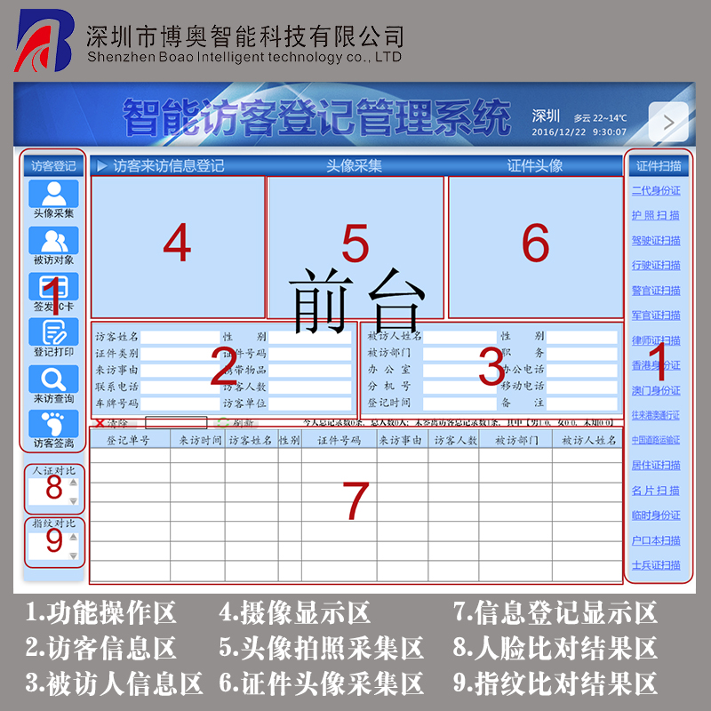 1.功能操作區(qū) 2.訪客信息區(qū) 3.被訪人信息區(qū) 4.攝像顯示區(qū) 5.頭像拍照采集區(qū) 6.證件頭像采集區(qū) 7.信息登記顯示區(qū) 8.人臉比對結(jié)果區(qū) 9.指紋比對結(jié)果區(qū)