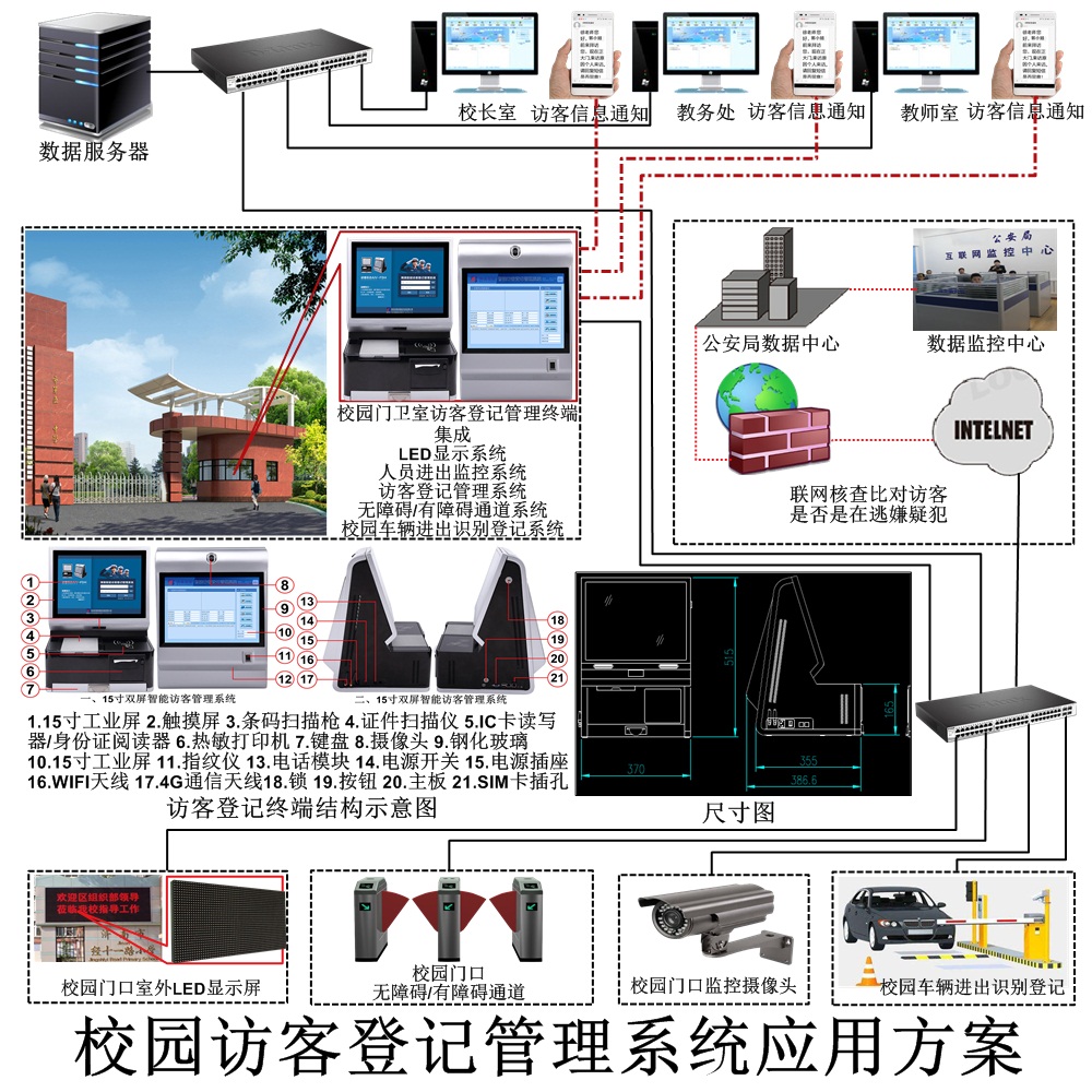 校門口LED顯示系統(tǒng):LED屏直接經(jīng)過交換機與訪客機終端相連,由訪客登記管理系控制用來發(fā)布學(xué)校信息通知,顯示人員進(jìn)出信息和快遞包裹信件信息,LED的尺寸及顯示模式參數(shù)由客戶選定。