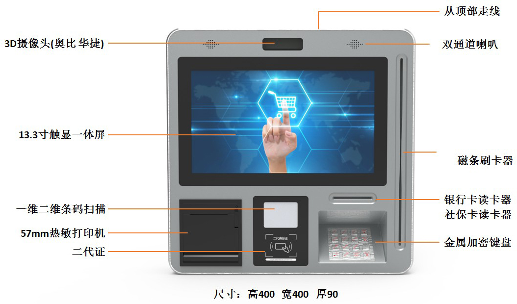 壁掛式社保一體機(jī)是博奧智能專為社保局、醫(yī)院、藥店等場(chǎng)所設(shè)計(jì)加工的一款集成多功能終端,采用安安卓系統(tǒng);本產(chǎn)品集成13.3寸觸顯一體屏、3D攝像頭(支持奧比、華捷)、熱敏打印機(jī)、身份證閱讀器、社??ㄣy行卡讀卡器、磁條刷卡器、一維二維碼掃描、密碼銀行等模組,主要用來實(shí)現(xiàn)社保查詢、醫(yī)療繳費(fèi)、購買藥品等。