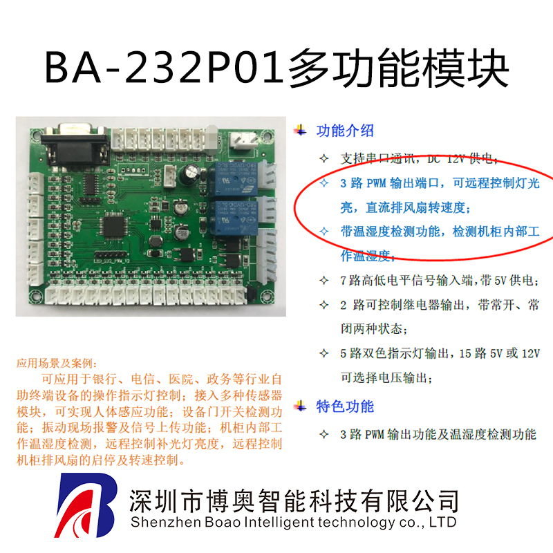 自助終端設備指示燈控制繼電器開PWM功能溫濕度檢測RS232多功能控制模塊 - 自助終端機|智能訪客機|軟件開發(fā)|電子硬件PCBA控制板開發(fā)|深圳市博奧智能科技有限公司 - 自助終端機|智能訪客機|軟件開發(fā)|電子硬件PCBA控制板開發(fā)|深圳市博奧智能科技有限公司