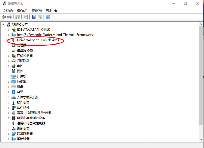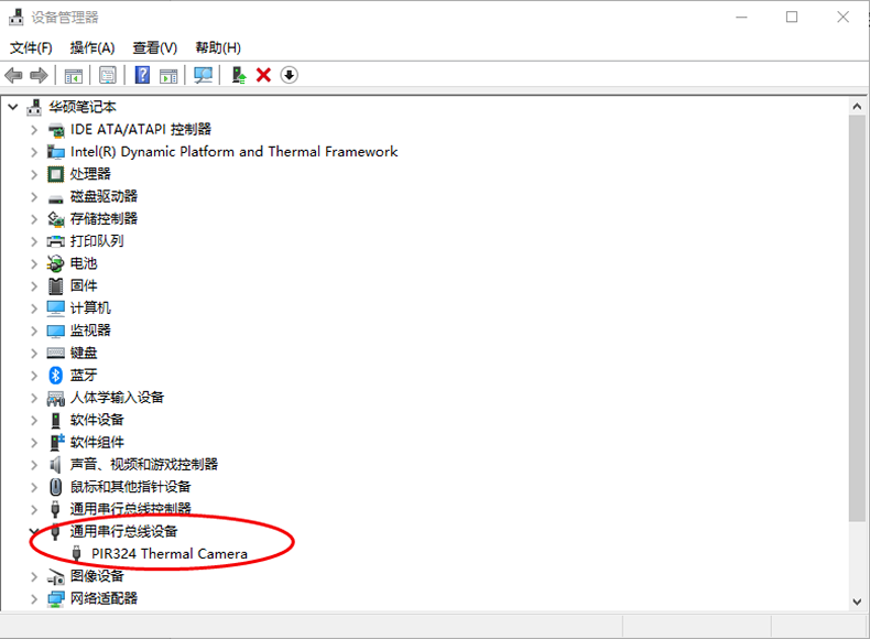 用Micro USB 2.0數(shù)據(jù)線連接電腦和R1相機(jī)后,打開“設(shè)備管理器”,找到“Universal Serial Bus devices”或者“通用串行總線”中的感嘆號設(shè)備“PIR324 Thermal Camera”