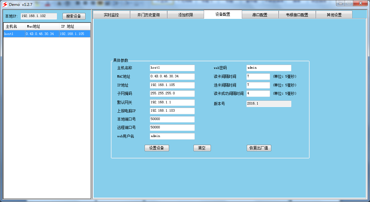 ??? ?將設(shè)備通過(guò)網(wǎng)線與電腦直接連接或者通過(guò)交換機(jī)連接,在軟件中點(diǎn)擊“搜索設(shè)備”按鈕,列表中將自動(dòng)列出網(wǎng)絡(luò)中的門禁控制器設(shè)備。選擇記錄后可以查看并修改此設(shè)備的配置。注意必須保證計(jì)算機(jī)IP地址與設(shè)備IP地址在同一個(gè)網(wǎng)段,默認(rèn)為192.168.1.XX,否則不能成功搜索和修改。(通過(guò)網(wǎng)線直連電腦的情況,可能因?yàn)榫W(wǎng)卡不能自適應(yīng)導(dǎo)致搜索或者配置不成功,建議通過(guò)路由器連接)。如果計(jì)算機(jī)IP地址已經(jīng)修改為192.168.1.XX仍然不能搜索到設(shè)備,可以人工恢復(fù)默認(rèn)設(shè)置(在斷電時(shí)按住恢復(fù)按鈕加電,5秒后松開(kāi),鳴蜂器響即恢復(fù)成功)。