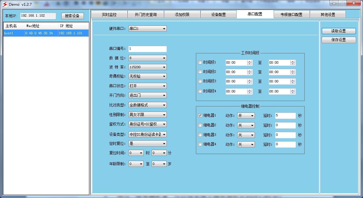 設(shè)備通過(guò)以太網(wǎng)接口與電腦連接,實(shí)現(xiàn)設(shè)備配置,權(quán)限配置,實(shí)時(shí)上報(bào)監(jiān)控,遠(yuǎn)程開(kāi)門,控制器歷史日志下載等。