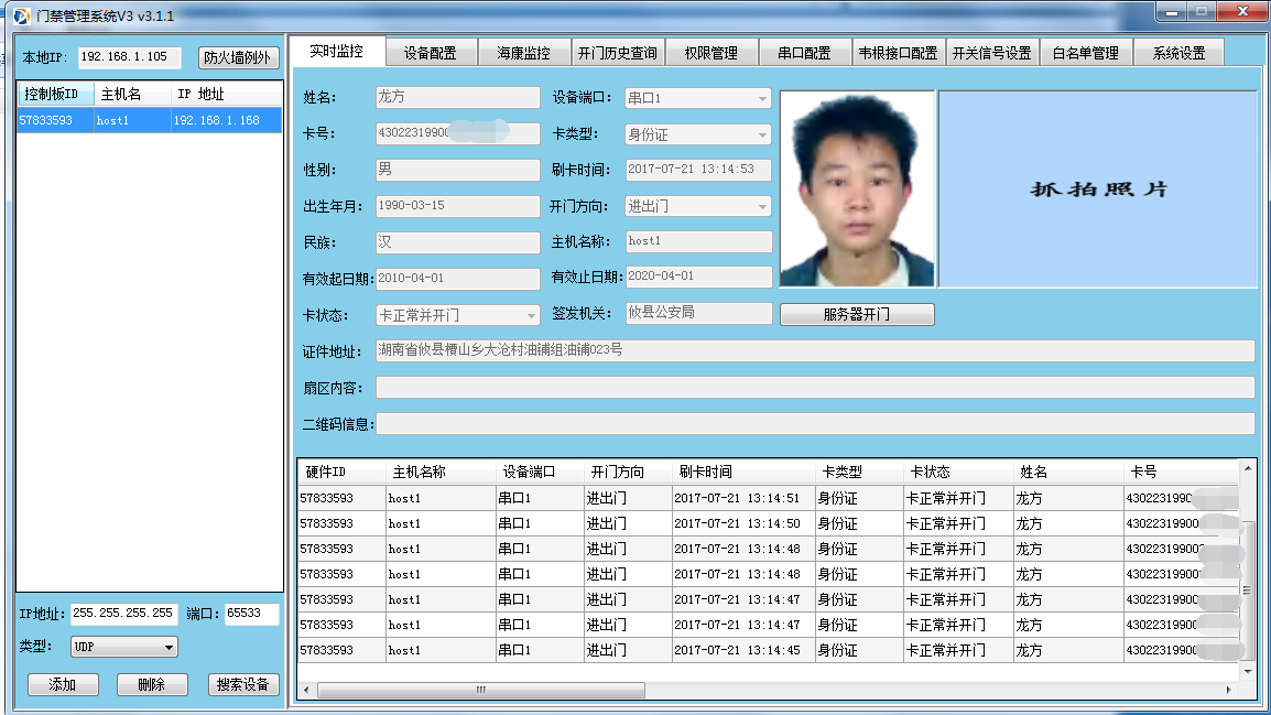 ??? 電腦白名單驗(yàn)證。設(shè)備讀取到身份證信息后,發(fā)送給電腦,則電腦軟件負(fù)責(zé)檢查身份證是否有開(kāi)門權(quán)限。這種方式可以通過(guò)電腦軟件實(shí)現(xiàn)大數(shù)據(jù)量的白名單驗(yàn)證,以及其它時(shí)段權(quán)限控制。