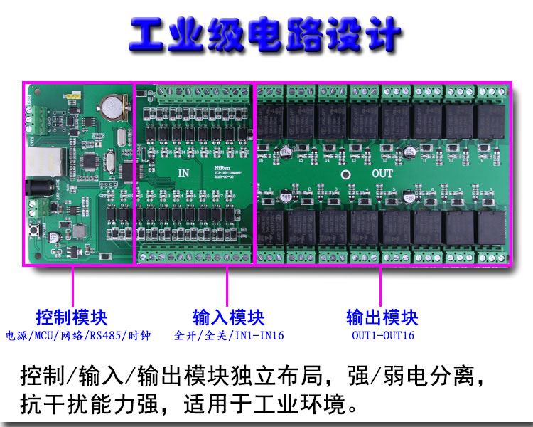 ??? 設(shè)備采用工業(yè)級(jí)設(shè)計(jì)方案,搭載32 ARM 處理器和10/100M 以太網(wǎng)網(wǎng)絡(luò)方案,具有速度快,運(yùn)算能力強(qiáng),穩(wěn)定性高,抗干擾能力強(qiáng)等特點(diǎn),滿足工業(yè)環(huán)境使用要求。設(shè)備有16 路繼電器輸出、18 路開關(guān)量隔離輸入和1 RS485 接口,繼電器支持實(shí)時(shí)控制、延時(shí)控制、輸入輸出聯(lián)動(dòng)控制、一鍵全開全關(guān)控制、日循環(huán)定時(shí)控制和自定義日期控制等多種控制方式,開關(guān)量輸入狀態(tài)支持被動(dòng)上傳、定時(shí)上傳和觸發(fā)上傳,RS485 接口支持用于控制設(shè)備或傳輸數(shù)據(jù),以滿足更多不同的場(chǎng)合使用,滿足更多用戶的使用需求。