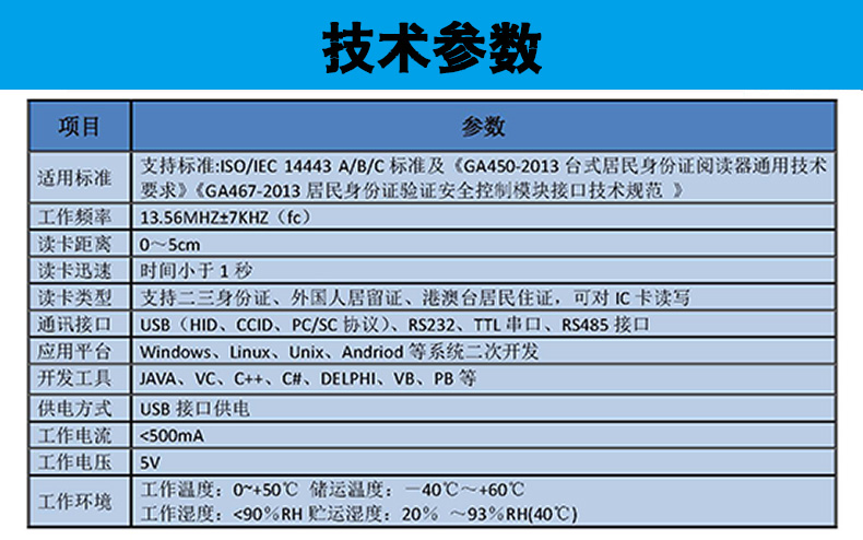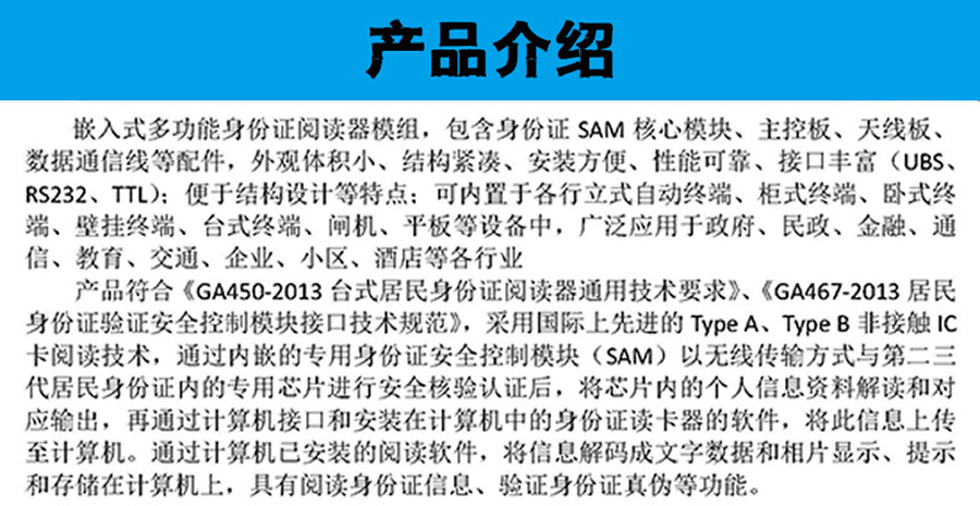 支持標準:ISO/IEC 14443 A/B/C標準及《GA450-2013臺式居民身份證閱讀器通用技術(shù)要求》《GA467-2013居民身份證驗證安全控制模塊接口技術(shù)規(guī)范 》