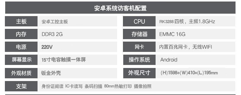 ?? ? ?15寸立式訪客機(jī)整機(jī)采用流線性設(shè)計(jì),符合人體工程原理,結(jié)構(gòu)合理,外形美觀大方,操作簡(jiǎn)單,維護(hù)方便;集成身份證閱讀 、IC卡讀寫(xiě)、 條碼掃描、 80mm熱敏打印、 攝像拍照、 多種證件OCR識(shí)別掃描(選配)功能,支持安卓和Windows系統(tǒng) ;產(chǎn)品主要用于政府機(jī)關(guān)、軍隊(duì)、公安、法院、學(xué)校、事業(yè)單位、花園小區(qū)、高檔寫(xiě)字樓、工廠等場(chǎng)所的門(mén)衛(wèi)傳達(dá)室對(duì)進(jìn)出人員信息化登記人證核驗(yàn),從而代替了傳統(tǒng)的手工登記,有效的提高了門(mén)衛(wèi)管理工作效率及證件信息登記準(zhǔn)確性,給日后的信息查詢(xún)工作更方便量更快捷。
