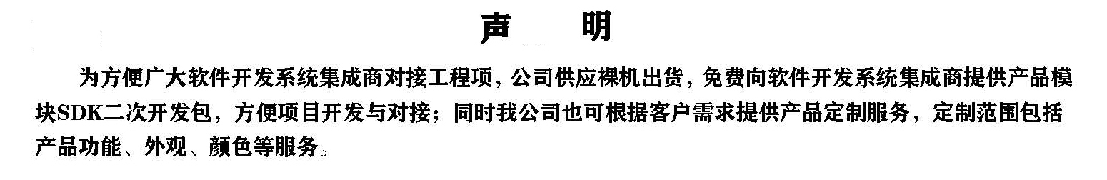 ? ? ? ? ??為方便廣大軟件開(kāi)發(fā)系統(tǒng)集成商對(duì)接工程項(xiàng),公司供應(yīng)裸機(jī)出貨,免費(fèi)向軟件開(kāi)發(fā)系統(tǒng)集成商提供產(chǎn)品模塊SDK二次開(kāi)發(fā)包,方便項(xiàng)目開(kāi)發(fā)與對(duì)接;同時(shí)我公司也可根據(jù)客戶(hù)需求提供產(chǎn)品定制服務(wù),定制范圍包括產(chǎn)品功能、外觀、顏色等服務(wù)。