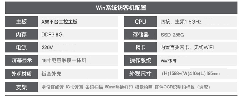 功能配置:身份證閱讀 IC卡讀寫(xiě) 條碼掃描 80mm熱敏打印 攝像拍照 多種證件OCR識(shí)別掃描(選配)