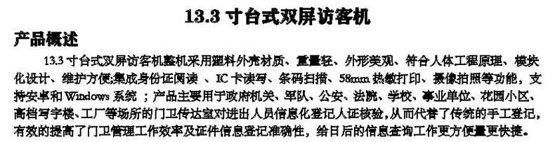 13.3寸臺式雙屏訪客機(jī)整機(jī)采用塑料外殼材質(zhì)、重量輕、外形美觀、符合人體工程原理、模塊化設(shè)計(jì)、維護(hù)方便;集成身份證閱讀 、IC卡讀寫、條碼掃描、58mm熱敏打印、攝像拍照等功能,支持安卓和Windows系統(tǒng) ;產(chǎn)品主要用于政府機(jī)關(guān)、軍隊(duì)、公安、法院、學(xué)校、事業(yè)單位、花園小區(qū)、高檔寫字樓、工廠等場所的門衛(wèi)傳達(dá)室對進(jìn)出人員信息化登記人證核驗(yàn),從而代替了傳統(tǒng)的手工登記,有效的提高了門衛(wèi)管理工作效率及證件信息登記準(zhǔn)確性,給日后的信息查詢工作更方便量更快捷。