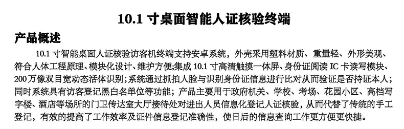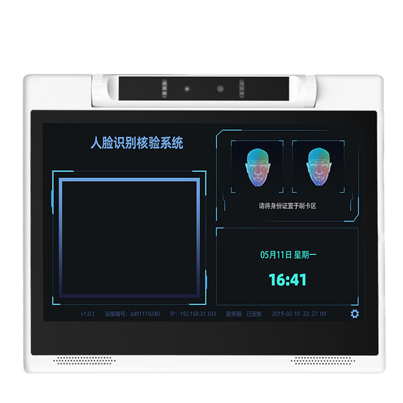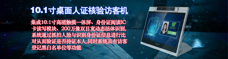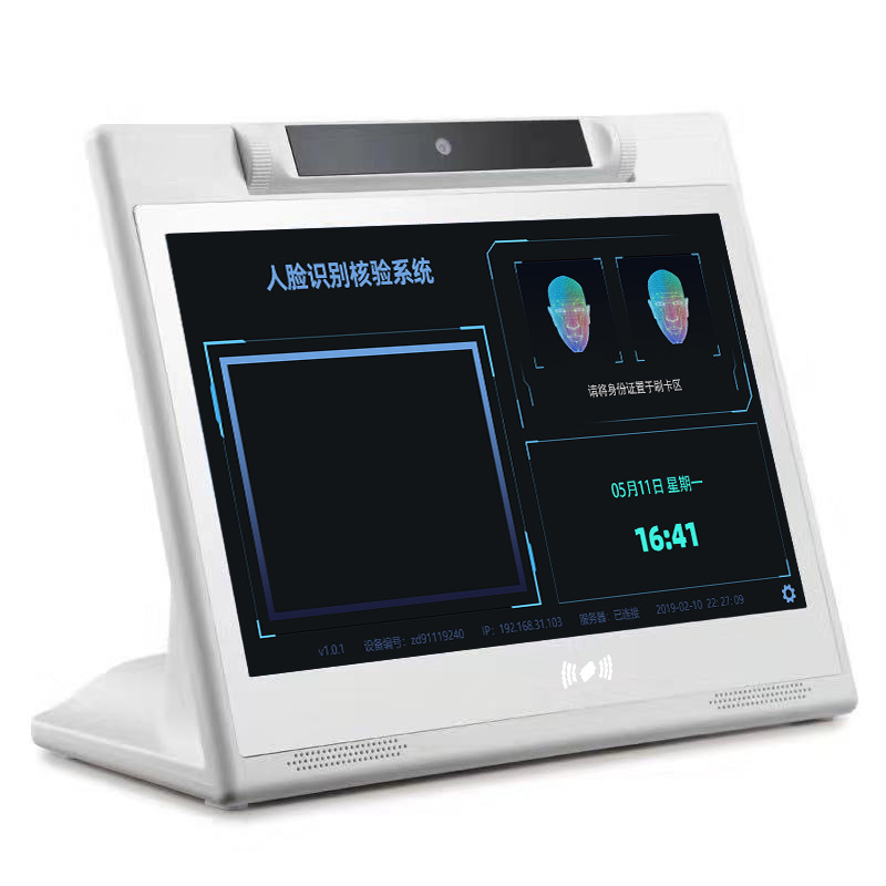 10.1寸智能桌面人證核驗(yàn)訪客機(jī)終端支持安卓系統(tǒng),外殼采用塑料材質(zhì)、重量輕、外形美觀、符合人體工程原理、模塊化設(shè)計(jì)、維護(hù)方便;集成10.1寸高清觸摸一體屏、身份證閱讀IC卡讀寫(xiě)模塊、200萬(wàn)像雙目寬動(dòng)態(tài)活體識(shí)別;系統(tǒng)通過(guò)抓拍人臉與識(shí)別身份證信息進(jìn)行比對(duì)從而驗(yàn)證是否持證本人;同時(shí)系統(tǒng)具有訪客登記黑白名單位等功能;產(chǎn)品主要用于政府機(jī)關(guān)、學(xué)校、考場(chǎng)、花園小區(qū)、高檔寫(xiě)字樓、酒店等場(chǎng)所的門(mén)衛(wèi)傳達(dá)室大廳接待處對(duì)進(jìn)出人員信息化登記人證核驗(yàn),從而代替了傳統(tǒng)的手工登記,有效的提高了工作效率及證件信息登記準(zhǔn)確性,使日后的信息查詢(xún)工作更方便更快捷。