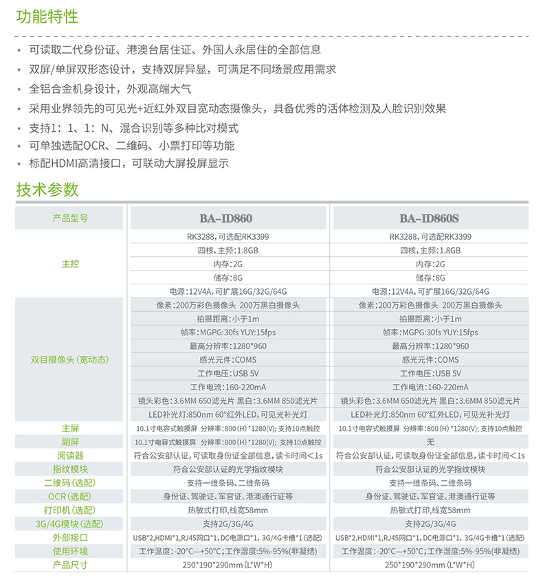 BA-ID860是一款基于Android安卓系統(tǒng)的桌面式雙屏多功能人證核驗訪客機終端,該產品集二代證閱讀、指紋比對、人臉比對等核驗功能于一體;支持雙屏顯示、二維碼掃描、OCR證件識別、58式小票打印等功能,外觀精美小巧,采用雙1 0.1 英寸高清電容操作屏,可隨意放置于桌面,滿足不同行業(yè)用戶的人證核驗需求,適用于各行業(yè)領域。