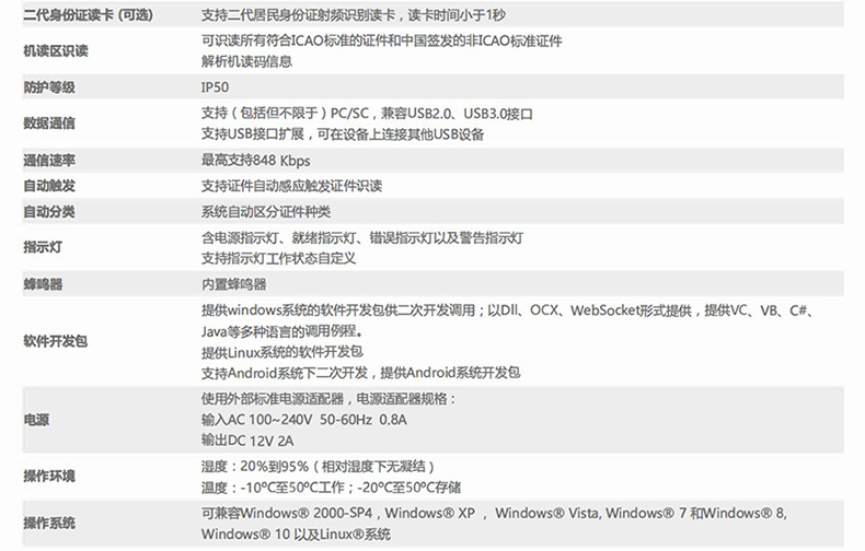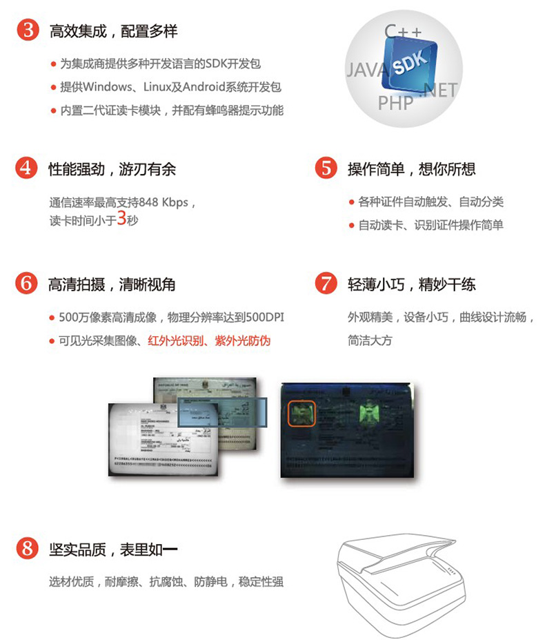 4)?? 高效集成,配置多樣:為集成商提供多種開發(fā)語言的 SDK 開發(fā)包;并且提供 Windows以及 Linux 下的開發(fā)包,同時(shí)內(nèi)置二代證讀卡模塊,并配有蜂鳴器提示功能;
