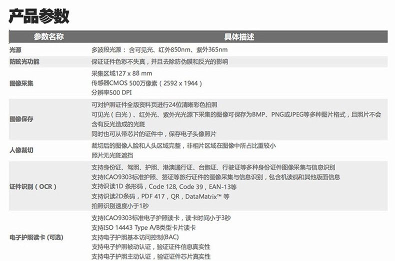 可識(shí)讀所有符合ICAO標(biāo)準(zhǔn)的證件和中國簽發(fā)的非 ICAO 標(biāo)準(zhǔn)證件 解析機(jī)讀碼信息 |