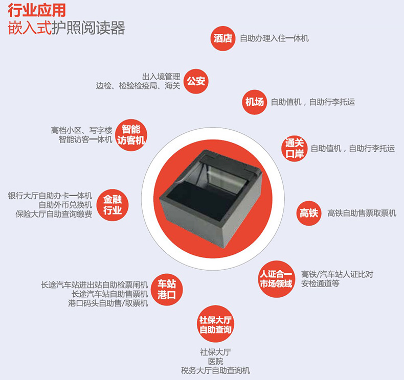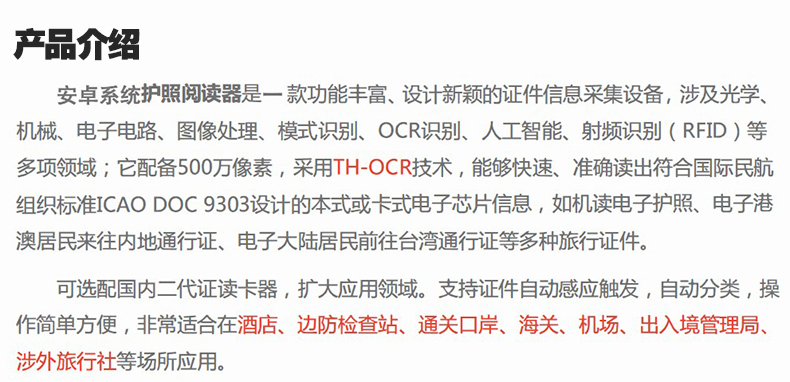 ? ? ? ?安卓護(hù)照閱讀機(jī)是一款功能豐富、設(shè)計(jì)新穎的證件信息采集設(shè)備,涉及光學(xué)、機(jī)械、電子電路、圖 像處理、模式識(shí)別、OCR 識(shí)別、人工智能、射頻識(shí)別(RFID)等多項(xiàng)領(lǐng)域;它配備 500 萬像素,采用 TH-OCR 技術(shù),能夠快速、準(zhǔn)確讀出符合國際民航組織標(biāo)準(zhǔn) ICAO DOC 9303 設(shè)計(jì)的本式或卡式電子芯片信息,如機(jī)讀電子護(hù)照、電子港奧居民來往內(nèi)地通行證、電子大陸居民前往臺(tái)灣通行證等多種旅行證件。