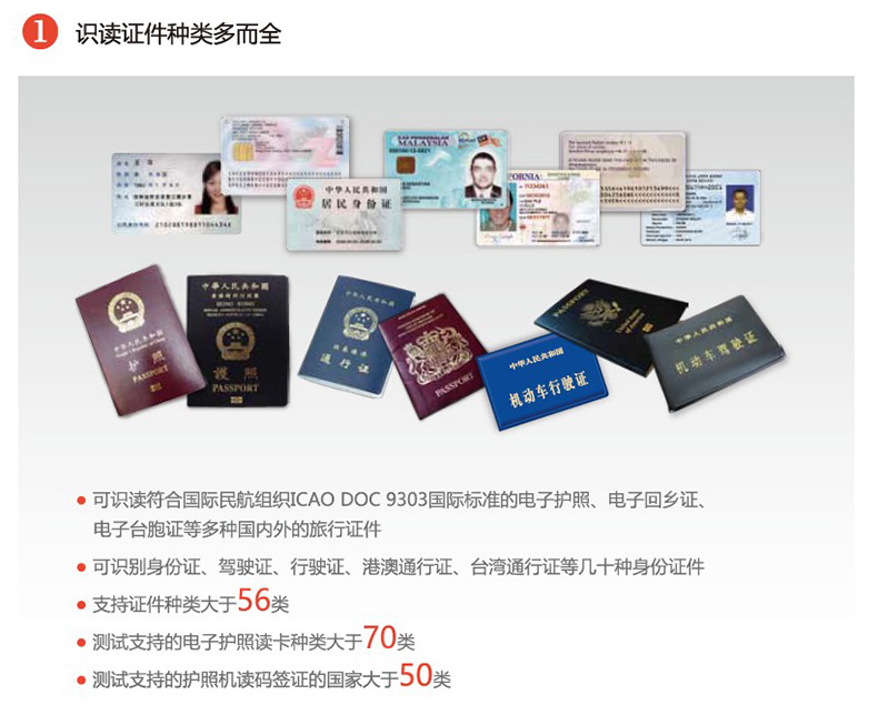 1)?? 識(shí)讀種證種類多而全:可識(shí)讀符合國際民航組織 ICAO DOC 9303 國際標(biāo)準(zhǔn)的電子護(hù)照、電子回鄉(xiāng)證、電子臺(tái)胞證等多種國內(nèi)外的旅行證件;還可以識(shí)別身份證、駕駛證、行駛證、港澳通行證、臺(tái)灣通行證等幾十種身份證件;