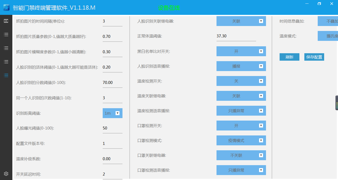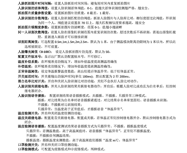 ???用戶可設(shè)置人臉抓拍的關(guān)鍵參數(shù)和開關(guān)設(shè)備功能。設(shè)備支持人臉識別比對、體溫檢測、口罩檢測三大功能,用戶可自由組合配置開關(guān)功能,是否關(guān)聯(lián)控制繼電器,是否播報(bào)語音提醒等。例如用戶要求體溫正常即可開門,則開啟體溫檢測功能,其余關(guān)閉即可實(shí)現(xiàn);若用戶要求規(guī)定的人,體溫正常且佩戴口罩后才可以開門,則必須同時(shí)開啟人臉識別比對、體溫檢測、口罩檢測,當(dāng)此三項(xiàng)全部檢測正常才會(huì)控制繼電器開門。配置界面和具體詳細(xì)如下所述。