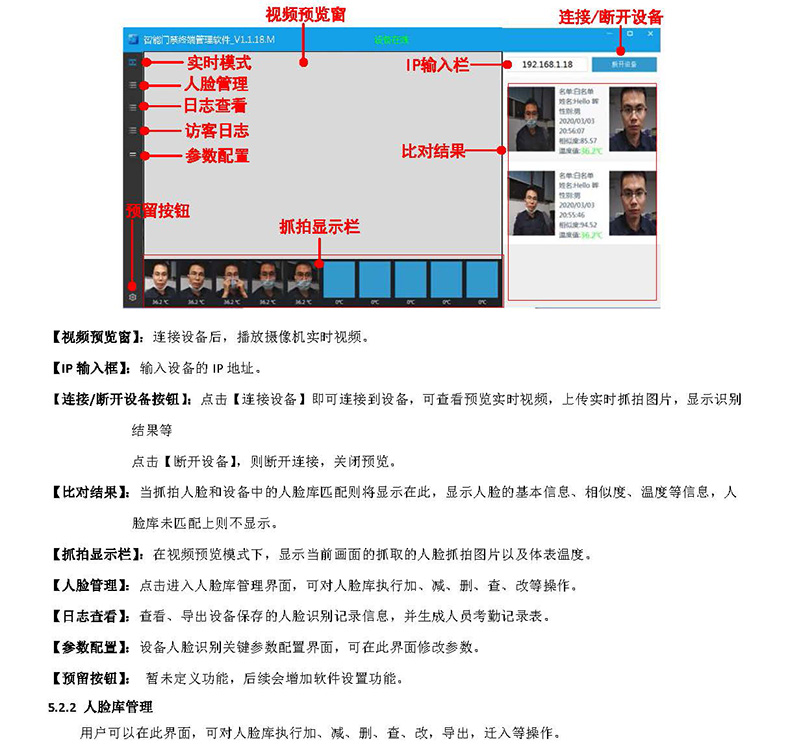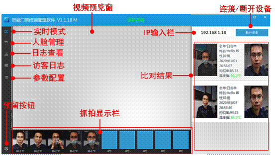 【抓拍顯示欄】:在視頻預(yù)覽模式下,顯示當(dāng)前畫面的抓取的人臉抓拍圖片以及體表溫度。