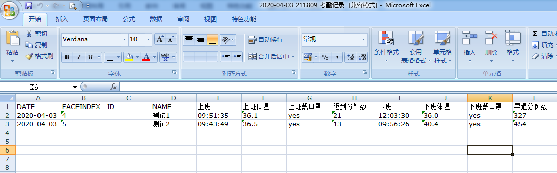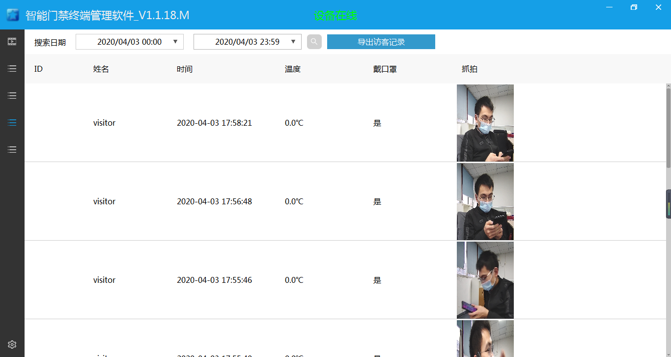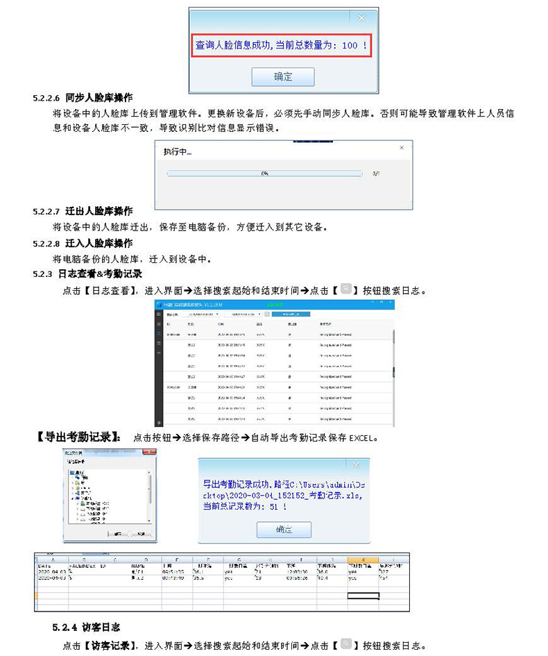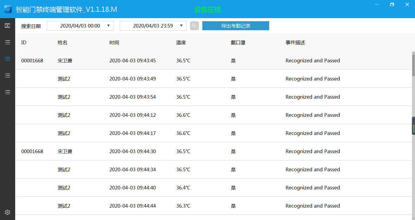【日志查看】:查看、導(dǎo)出設(shè)備保存的人臉識別記錄信息,并生成人員考勤記錄表。