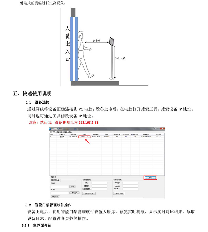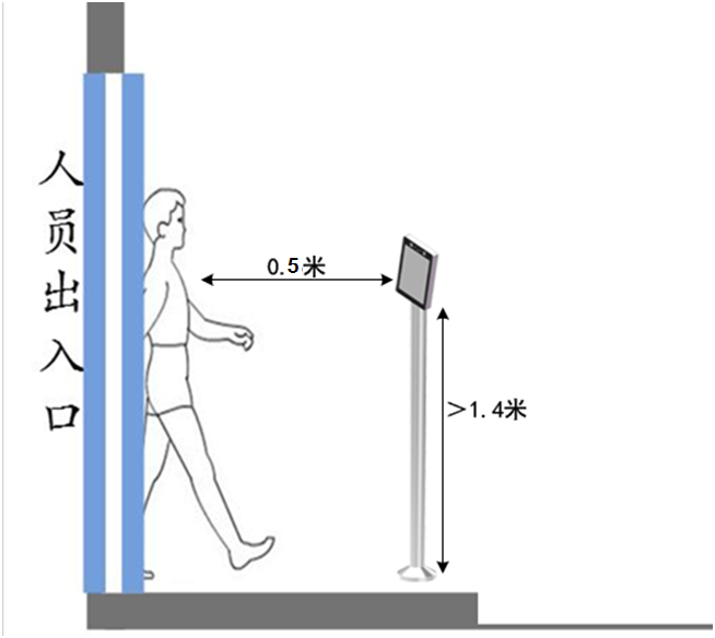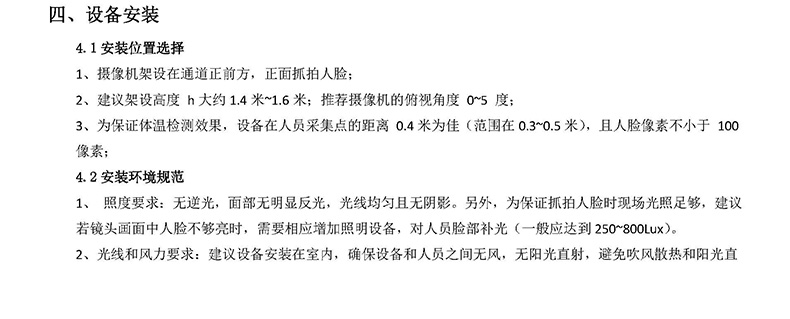 3、為保證體溫檢測效果,設(shè)備在人員采集點(diǎn)的距離 0.4米為佳(范圍在0.3~0.5米),且人臉像素不小于 100像素;
