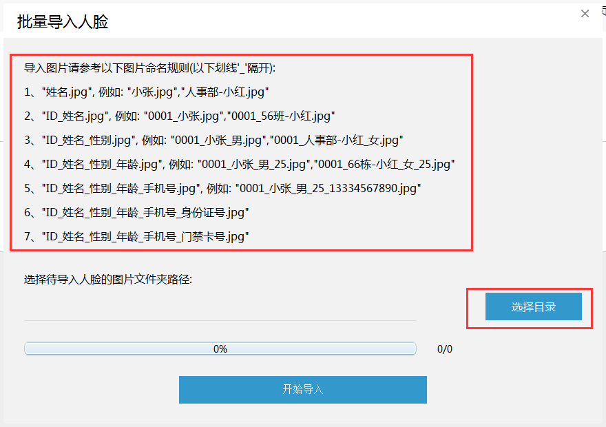 點(diǎn)擊【批量導(dǎo)入】,彈出界面è點(diǎn)擊【選擇目錄】,選擇人臉圖片文件夾è點(diǎn)擊【開始導(dǎo)入】,導(dǎo)入進(jìn)度條完成即完成批量導(dǎo)入人臉操作。