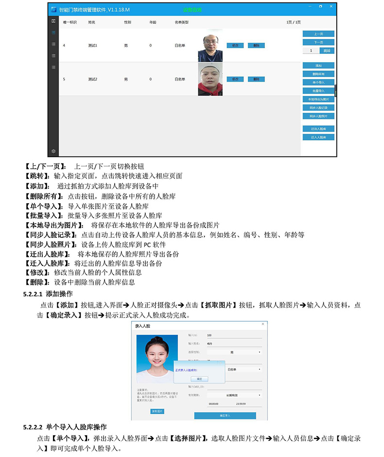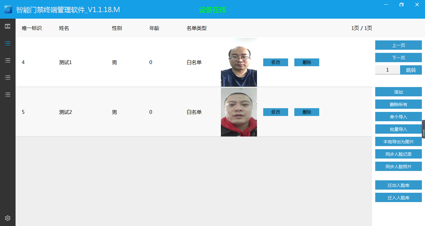 ??? 用戶可以在此界面,可對人臉庫執(zhí)行加、減、刪、查、改,導(dǎo)出,遷入等操作。