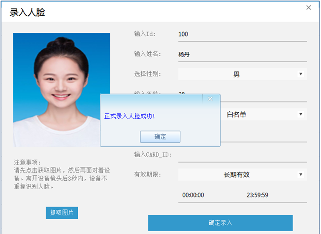 ?點(diǎn)擊【添加】按鈕,進(jìn)入界面è人臉正對攝像頭è點(diǎn)擊【抓取圖片】按鈕,抓取人臉圖片è輸入人員資料,點(diǎn)擊【確定錄入】按鈕è提示正式錄入人臉成功完成。