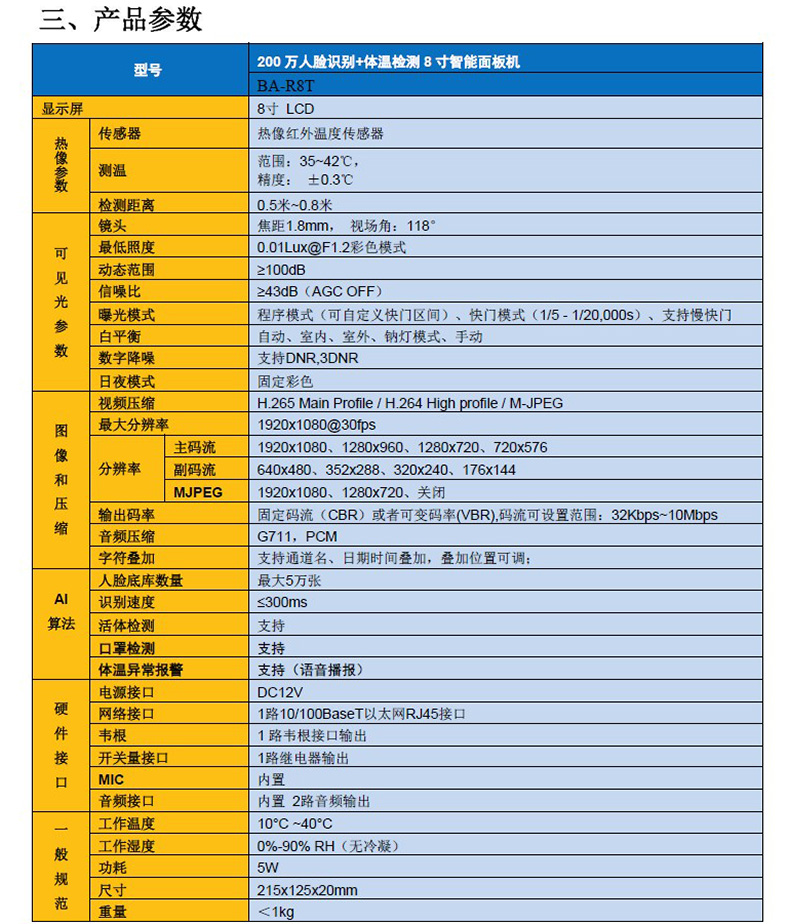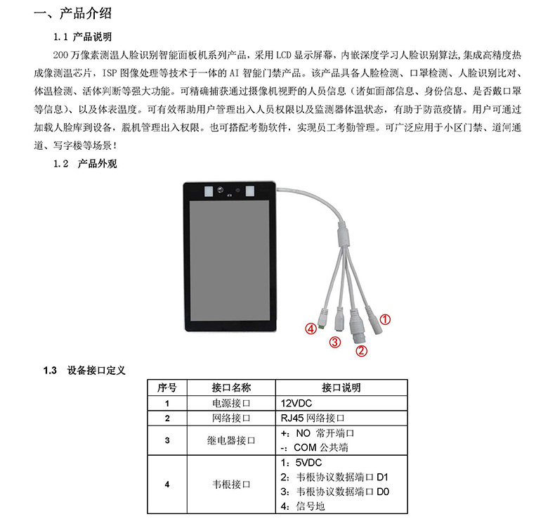 200萬像素測溫人臉識別智能面板機(jī)系列產(chǎn)品,采用LCD顯示屏幕,內(nèi)嵌深度學(xué)習(xí)人臉識別算法,集成高精度熱成像測溫芯片,ISP圖像處理等技術(shù)于一體的AI智能門禁產(chǎn)品。該產(chǎn)品具備人臉檢測、口罩檢測、人臉識別比對、體溫檢測、活體判斷等強(qiáng)大功能。可精確捕獲通過攝像機(jī)視野的人員信息(諸如面部信息、身份信息、是否戴口罩等信息)、以及體表溫度。可有效幫助用戶管理出入人員權(quán)限以及監(jiān)測器體溫狀態(tài),有助于防范疫情。用戶可通過加載人臉庫到設(shè)備,脫機(jī)管理出入權(quán)限。也可搭配考勤軟件,實(shí)現(xiàn)員工考勤管理??蓮V泛應(yīng)用于小區(qū)門禁、道閘通道、寫字樓等場景!