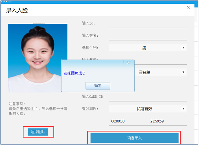 點(diǎn)擊【單個(gè)導(dǎo)入】,彈出錄入人臉界面è點(diǎn)擊【選擇圖片】,選取人臉圖片文件è輸入人員信息è點(diǎn)擊【確定錄入】即可完成單個(gè)人臉導(dǎo)入。