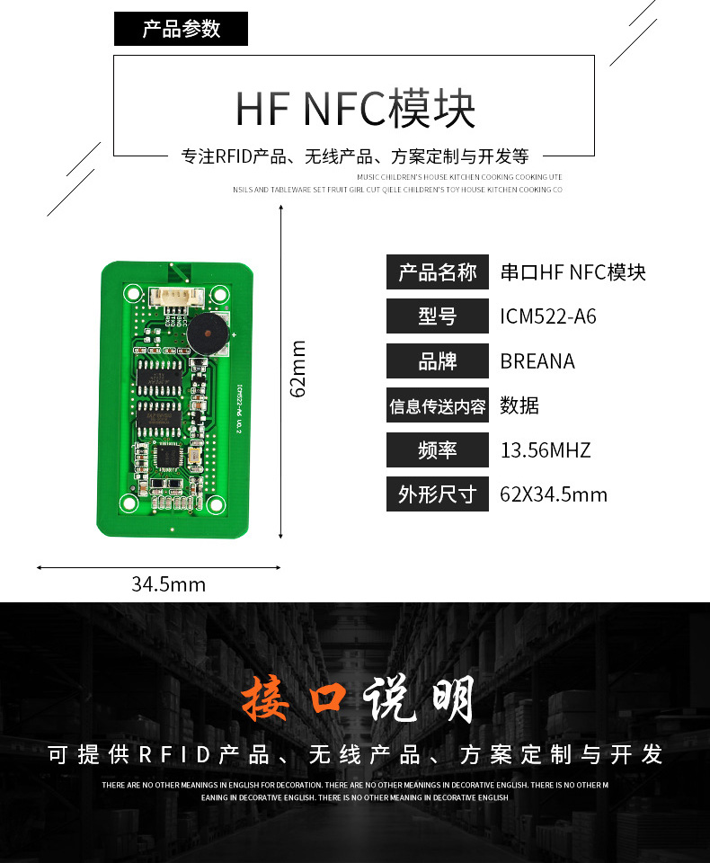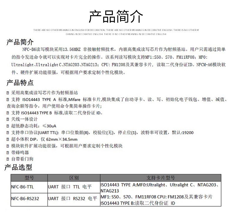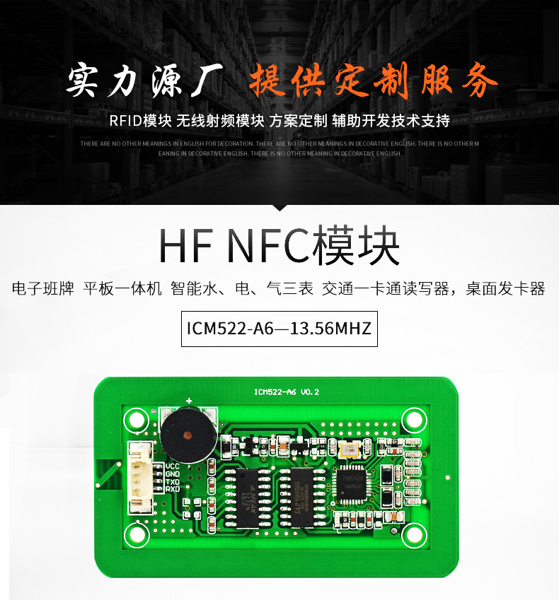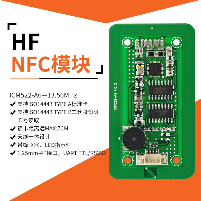 NFC-B6讀寫模塊采用13.56MHZ 非接觸射頻技術,內(nèi)嵌高集成讀寫芯片作為射頻基站。用戶只需通過簡單的指令發(fā)送命令就可以實現(xiàn)對卡片完全的操作。該系列讀寫模塊支持MF1:S50、S70、FM11RF08;MF0: Ultralight、Ultralight C、NTAG203、NTAG213;CPU: FM1208及其兼容卡片, 讀取二代身份證ID。NFCM-A6模塊軟件、硬件擴展功能很強,可根據(jù)用戶要求定制個性化模塊。