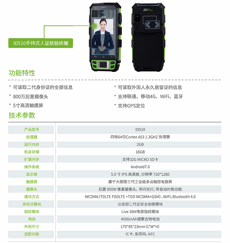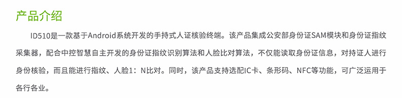 產品介紹 博奧智能ID510是—款基于Android系統開發(fā)的手持式人證核驗終端。該產品集成公安部身份證SAM模塊和身份證指紋采集器,配合中控智慧自主開發(fā)的身份證指紋識別算法和人臉比對算法,不僅能讀取身份證信息,對持證人進行身份核驗,而且能進行指紋、人臉1: N比對。同時該產品支持選配IC卡、條形碼、NFC等功能,可廣泛運用于各行各業(yè)。