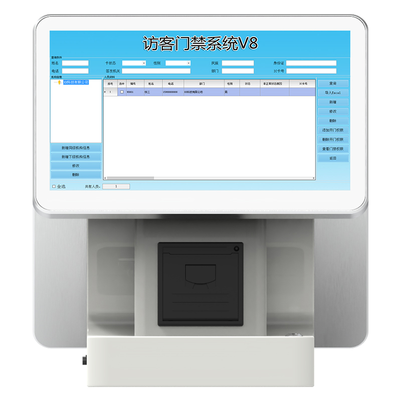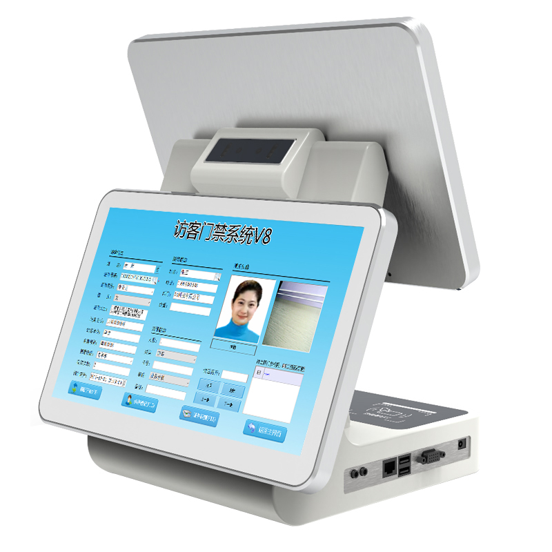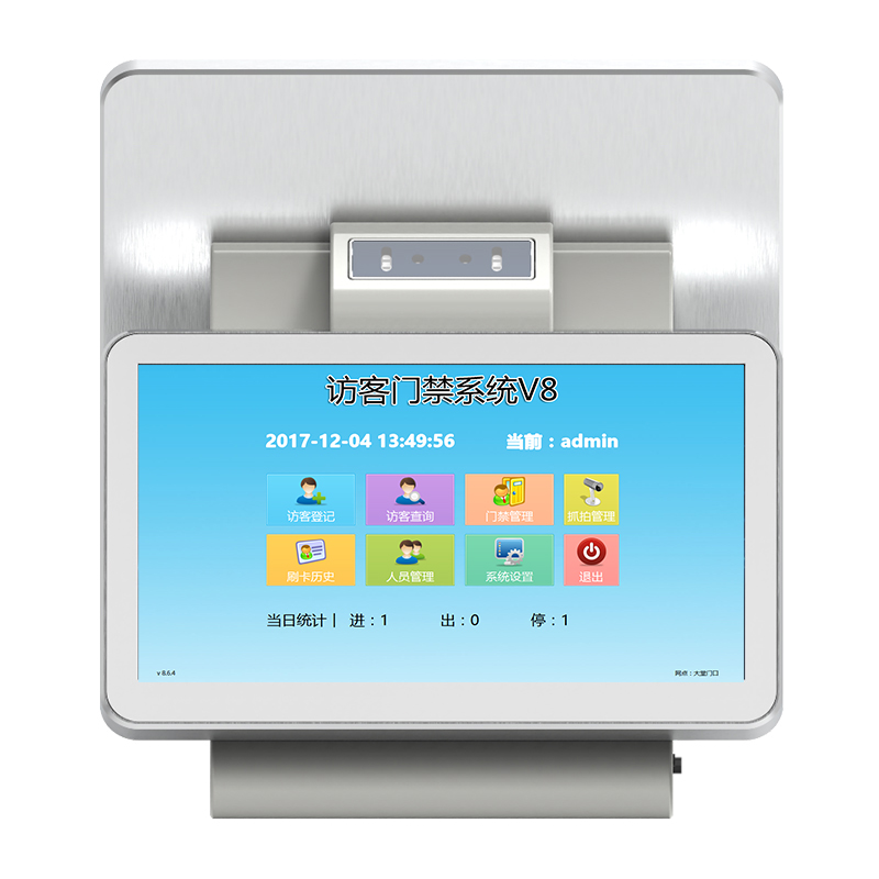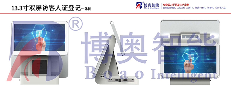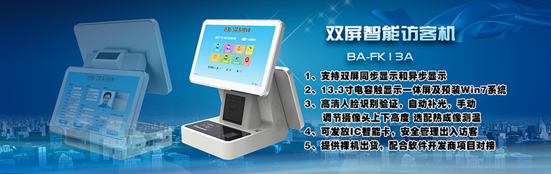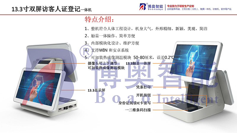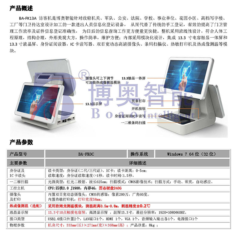 BA-FK13A訪客機(jī)是博奧智能針對政府機(jī)關(guān)、軍隊、公安、法院、學(xué)校、事業(yè)單位、花園小區(qū)、高檔寫字樓、工廠等門衛(wèi)傳達(dá)室設(shè)計加工的一款進(jìn)出人員信息化登記設(shè)備, 從而代替了傳統(tǒng)的手工登記,有效的提高了門衛(wèi)管理工作效率及證件信息登記準(zhǔn)確性, 為日后的信息查詢工作更方便量更快捷。整機(jī)采用流線性設(shè)計,符合人體工程原理,結(jié)構(gòu)合理,外形美觀大方,操作簡單,維護(hù)方便;內(nèi)部采用模塊化設(shè)計,集成13.3寸電容觸顯一體屏和13.3寸液晶屏、身份證閱讀器,IC卡讀寫器、雙目寬動態(tài)高清攝像頭、條碼掃描儀、熱敏打印機(jī)及熱成像測溫等模塊。