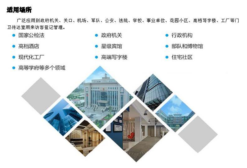 1、刷身份證(二代/三代證)自動讀取信息, 2、現(xiàn)場拍照人像采集并保存。支持人證比對 3、來訪單位、來訪事由、車輛、攜帶物品等信息登記 。 4、被訪人信息登記:(1)被訪人姓名模糊查詢,輸入姓名的第一個字、或首字母、手機(jī)號、電話號碼、模糊查詢,系統(tǒng)自動帶出相應(yīng)的被訪人信息;(2)選擇被訪對象,多人來訪快速登記; 5、IC常訪卡快速登記;來訪預(yù)約登記管理。 6、提醒功能:身份證真假識別、黑名單提醒、VIP訪客提醒; 當(dāng)日訪客人數(shù)、訪客離開人數(shù)、未離開人數(shù)自動顯示;訪客離開/未離開記錄區(qū)別顯示;常訪卡有效期提醒、離開未登記提醒、訪客來訪歷史提醒。 7、打印訪客單或發(fā)放IC卡,身份證,二維碼;登記數(shù)據(jù)保存到數(shù)據(jù)庫 8、★支持多臺聯(lián)網(wǎng),人證比對,刷卡抓拍,查看前后10秒錄像,實(shí)時監(jiān)控查看 9、支持訪客信息臨時保存,等需要時,再快速顯示。 10、支持訪客及被訪人短信通知,可更改通知內(nèi)容模板 11、★微信預(yù)約界面可以自定義字段,最多可設(shè)置20個字段,功能,微信審核功能,微信查詢預(yù)約記錄(微信預(yù)約功能需要單獨(dú)購買公眾號預(yù)約平臺)。 12、★可以網(wǎng)頁查詢微信預(yù)約記錄,可以導(dǎo)出記錄 13、★可以網(wǎng)頁導(dǎo)入微信被訪人員工信息 14、★可添加海康錄像機(jī),查看錄像及照片,現(xiàn)場情況一目了然 15、★可自行添加掃描的證件類型號,共有79種證件可以快速識別錄入,不需要手工輸入,效率超快。 16、★查詢統(tǒng)計導(dǎo)出界面的字段,可以自行添加刪除,把你用不上的字段可以直接移除。 17、★可以批量導(dǎo)入被訪人信息,批量添加內(nèi)部人員權(quán)限到門禁 18、★觸屏輸入法,可以輸入中文,字母,數(shù)字,手寫,英文(非系統(tǒng)自帶鍵盤,采用蘋果風(fēng)格,讓輸入更清松) 19、★可以自定義界面風(fēng)格圖,LOGO,標(biāo)題 20、登記時,提示第幾次來訪 21、登記界面,可以多個攝像頭之間切換 22、電話自動撥號(需購買撥號器) 23、刷身份證自動比對人臉 24、二維碼讀頭支持掃微信預(yù)約二維碼 |