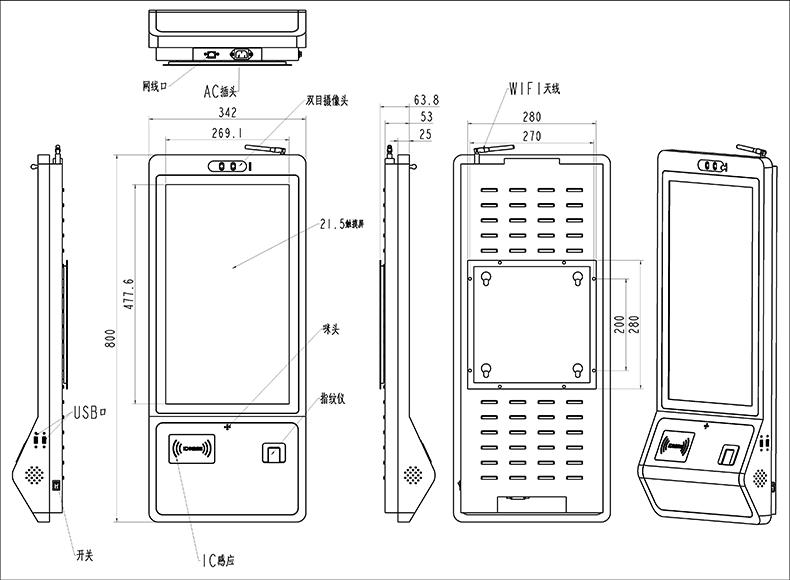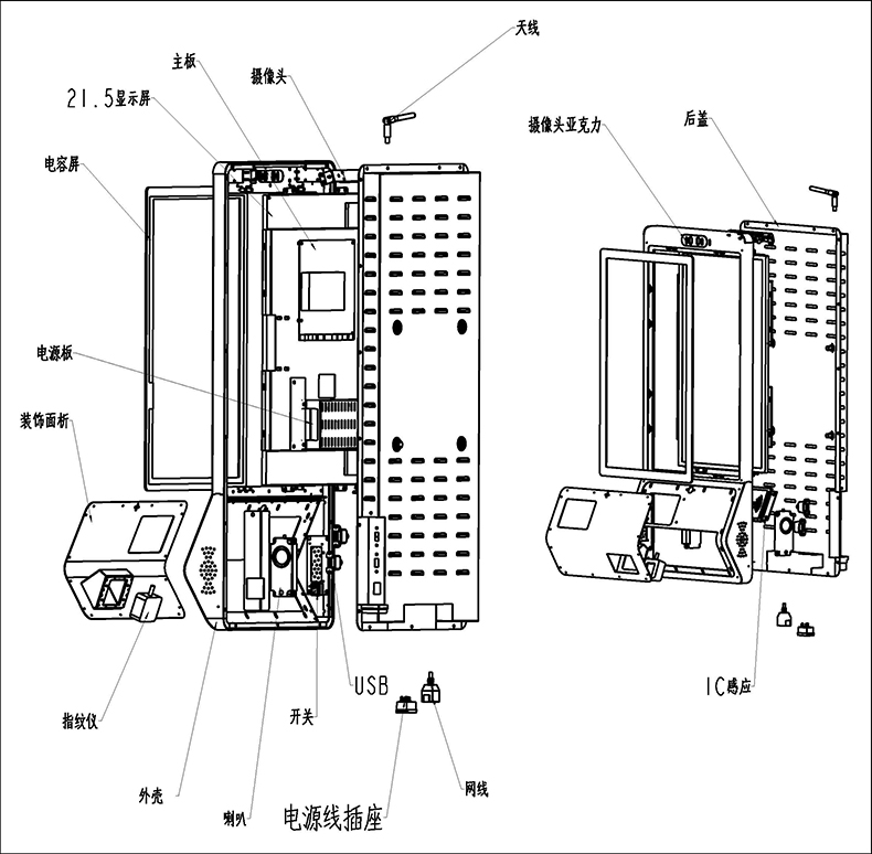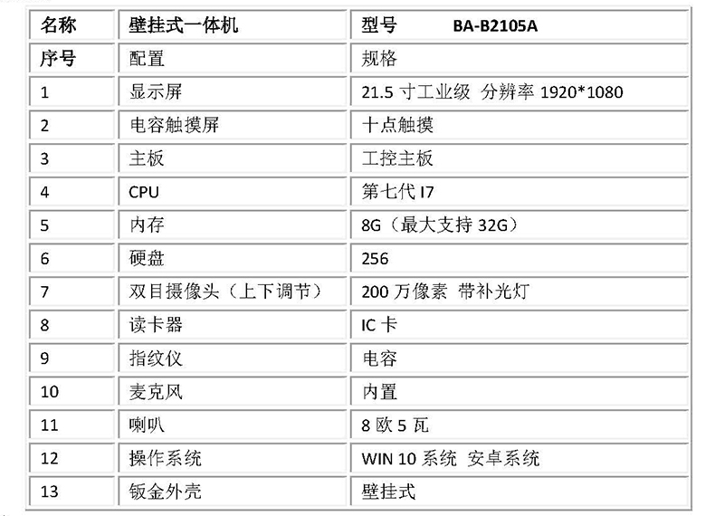 ? ?? ? BA-B2105A多功能壁掛式觸摸一體機支持WIN系統(tǒng)和安卓系統(tǒng),模塊化設(shè)計,結(jié)構(gòu)合理;主要集成21.5寸高分辨率顯示屏、防爆多點電容觸摸、寬動態(tài)高清雙目攝像頭、IC卡讀寫器、指紋儀,并且根據(jù)功能需求可配置身份證閱讀器、熱敏小票打印機、條碼掃描儀等配件;?外殼采購鈑金材質(zhì),結(jié)實牢固;表面采用烤漆工藝,外觀精美實用,搭配各類軟件可適用于多種場合,比如酒店自助入助登記終端,商場自助收銀終端,高檔小區(qū)門衛(wèi)寫字樓大廳前臺用于來訪人員登記管理終端等。