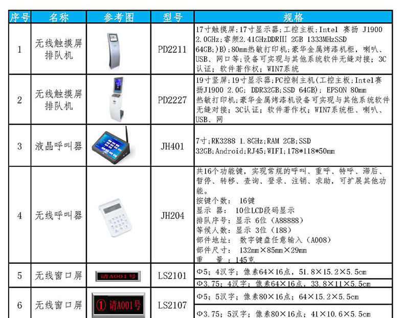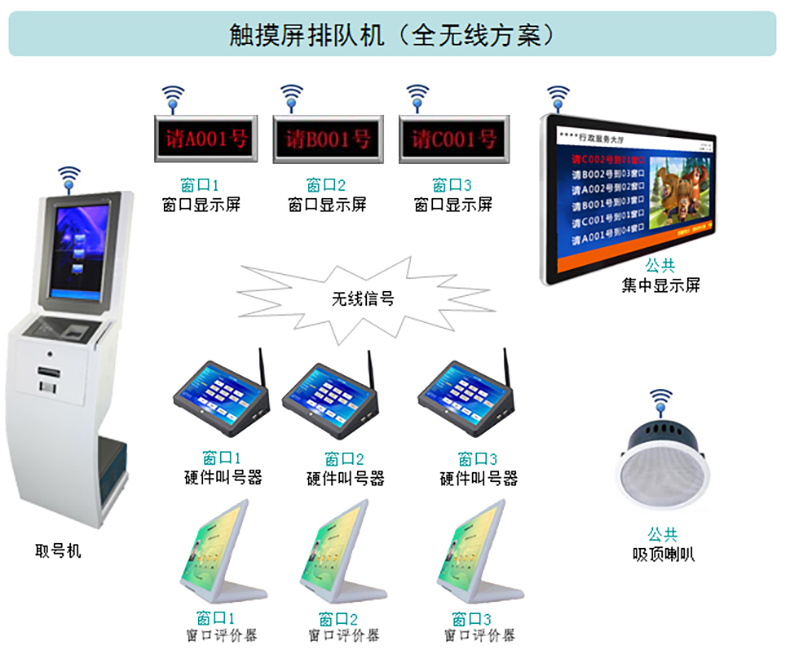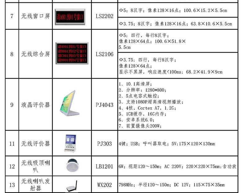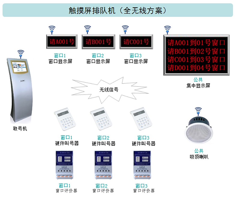 產(chǎn)品配置:無(wú)線觸摸屏排隊(duì)機(jī) 液晶呼叫器 無(wú)線呼叫器 無(wú)線窗口屏 無(wú)線綜合屏 無(wú)線評(píng)價(jià)器 無(wú)線吸頂喇叭 液晶窗口顯示屏 液晶集中顯示屏