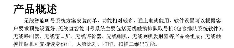 無(wú)線智能叫號(hào)系統(tǒng)方案安裝簡(jiǎn)單,功能相對(duì)較多,通上電就能用,軟件設(shè)置可以根據(jù)客戶要求預(yù)先設(shè)置好;無(wú)線盤智能叫號(hào)系統(tǒng)主要包括無(wú)線觸摸排隊(duì)取號(hào)機(jī)(包含排隊(duì)系統(tǒng)軟件)、無(wú)線呼叫器、無(wú)線窗口屏、無(wú)線評(píng)價(jià)器、無(wú)線喇叭、無(wú)線喇叭發(fā)射器等產(chǎn)品終組成;無(wú)線觸摸排隊(duì)機(jī)可支持讀身份證,人臉比對(duì)、打印,掃描二維碼功能。