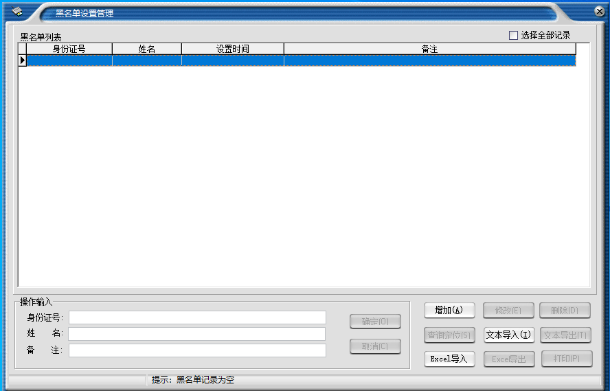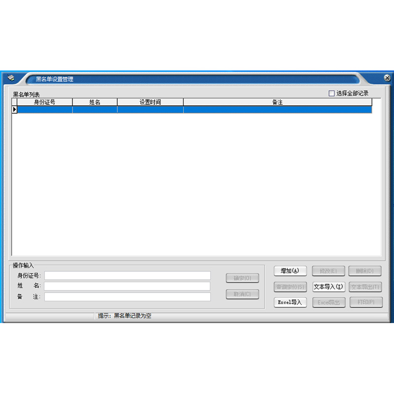 按身份證號(hào)、姓名設(shè)置黑名單信息,還可以在備注信息中填寫關(guān)于黑名單的附加信息。黑名單的設(shè)置可以在黑名單維護(hù)窗體中進(jìn)行,也可以在刷卡流水查詢窗體,點(diǎn)擊“置黑名單”按鈕設(shè)置。