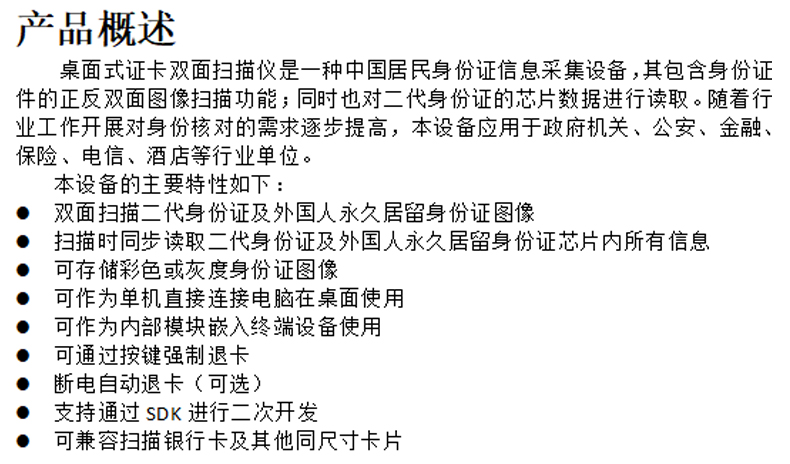 桌面式證卡雙面掃描儀是一種中國居民身份證信息采集設備,其包含身份證件的正反雙面圖像掃描功能;同時也對二代身份證的芯片數(shù)據(jù)進行讀取。隨著行業(yè)工作開展對身份核對的需求逐步提高,本設備應用于政府機關、公安、金融、保險、電信、酒店等行業(yè)單位。