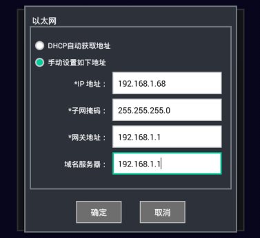 終端網(wǎng)絡(luò)配置可以選擇以太網(wǎng)、WiFi和移動(dòng)網(wǎng)絡(luò)中的一種并配置相應(yīng)的參數(shù)。以太網(wǎng)設(shè)置界面如下圖所示,可以選擇DHCP自動(dòng)獲取地址(局域網(wǎng)中有DHCP服務(wù)器則建議使用)或者手動(dòng)設(shè)置如下地址(局域網(wǎng)中午DHCP服務(wù)器或者不允許使用動(dòng)態(tài)地址時(shí)使用)。