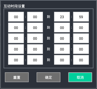 互動(dòng)時(shí)段設(shè)置界面如下圖所示,最多可設(shè)置五個(gè)終端機(jī)的互動(dòng)時(shí)段,00:00~00:00表示空配置項(xiàng),00:00~23:59表示全天均可互動(dòng)。終端機(jī)只有在配置的互動(dòng)時(shí)段內(nèi)才可以通過(guò)交互觸發(fā)互動(dòng)節(jié)目的播放。