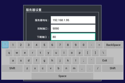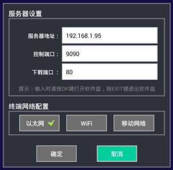 終端服務(wù)器設(shè)置中的服務(wù)器地址為終端需要連接到信息發(fā)布服務(wù)器電腦的IP地址(注:需要填寫(xiě)電腦實(shí)際IP地址,請(qǐng)不要填127.0.0.1的地址)或者域名(域名前請(qǐng)不要添加http://前綴);控制端口為終端實(shí)時(shí)在線控制服務(wù)端口號(hào)如9090;下載端口為內(nèi)容下載服務(wù)器端口號(hào)如80??刂贫丝诤拖螺d端口實(shí)際上是服務(wù)器端的配置參數(shù),終端需要連接到服務(wù)器就必須和服務(wù)器的設(shè)置端口完全一致。
