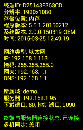 BA-iDS6終端軟件內(nèi)置安裝在安卓主板上,主板開(kāi)機(jī)后自動(dòng)運(yùn)行終端程序進(jìn)入播放狀態(tài)。按遙控器的INFO鍵,或快速點(diǎn)擊屏幕任意一個(gè)角落四次,可呼出如下圖所示的終端運(yùn)行狀態(tài)信息,包括終端ID、分辨率、節(jié)目存儲(chǔ)位置、播放程序版本、安卓系統(tǒng)版本、機(jī)器時(shí)間、網(wǎng)絡(luò)參數(shù)、服務(wù)器參數(shù)、終端到服務(wù)器的連接狀態(tài)、多級(jí)同步開(kāi)關(guān)等信息。
