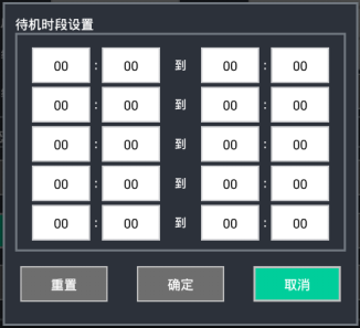 待機(jī)時(shí)段設(shè)置界面如下圖所示,最多可設(shè)置五個(gè)終端機(jī)的待機(jī)時(shí)段,00:00~00:00表示空配置項(xiàng)。終端機(jī)一旦進(jìn)入待機(jī)時(shí)段時(shí)間點(diǎn)則停止播放且輸出黑屏。