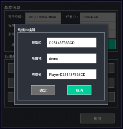 終端基本信息中的[設(shè)置]按鈕彈出界面如下圖所示,可進(jìn)行終端ID、所屬域、終端名稱(chēng)的編輯。終端所屬域定義了終端在服務(wù)器的在哪個(gè)域中可見(jiàn),如果為空則默認(rèn)為demo域。請(qǐng)注意:如果服務(wù)器強(qiáng)制將終端錄入到了某個(gè)域,則終端一旦聯(lián)網(wǎng)就會(huì)自動(dòng)轉(zhuǎn)換到相應(yīng)的域