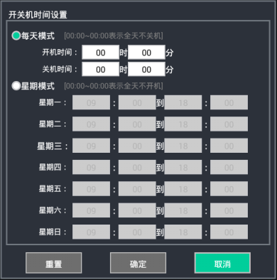 開(kāi)關(guān)時(shí)間設(shè)置用于設(shè)定終端機(jī)的定時(shí)開(kāi)關(guān)機(jī)時(shí)間,包括每天模式和星期模式兩種模式。每天模式指定終端機(jī)每天的開(kāi)機(jī)時(shí)間點(diǎn)和關(guān)機(jī)時(shí)間點(diǎn);全天不關(guān)機(jī)則設(shè)定為00:00~00:00。星期模式指定終端機(jī)每周天的具體開(kāi)關(guān)機(jī)時(shí)間;某個(gè)周天不開(kāi)機(jī)則設(shè)定為00:00~00:00。