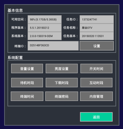 終端系統(tǒng)配置功能中包括音量設(shè)置、亮度設(shè)置、開(kāi)關(guān)時(shí)間、待機(jī)時(shí)段、下載時(shí)段、互動(dòng)時(shí)段、終端時(shí)間、終端密碼、內(nèi)容管理等。