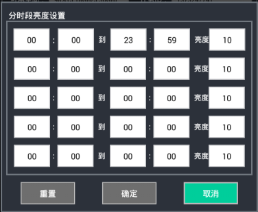 亮度設(shè)置界面如下圖所示,最多可指定5個(gè)不同時(shí)段的亮度,默認(rèn)情況下全天不分時(shí)段則只需要指定第一段00:00~23:59的亮度值。亮度值通常是0最暗、10最亮,但是有些LED屏的背光電路亮暗邏輯是反的。