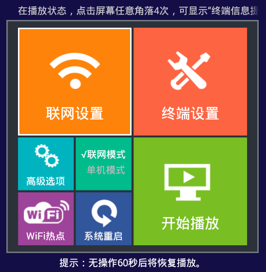 終端后臺(tái)設(shè)置界面包括7個(gè)子功能按鈕(注:若軟件界面有差異是因?yàn)槲锤碌阶钚掳姹?,但不影響使用可以忽略):?lián)網(wǎng)設(shè)置、終端設(shè)置、高級(jí)選項(xiàng)、聯(lián)網(wǎng)/單機(jī)模式、WiFi熱點(diǎn)、系統(tǒng)重啟和開(kāi)始播放。